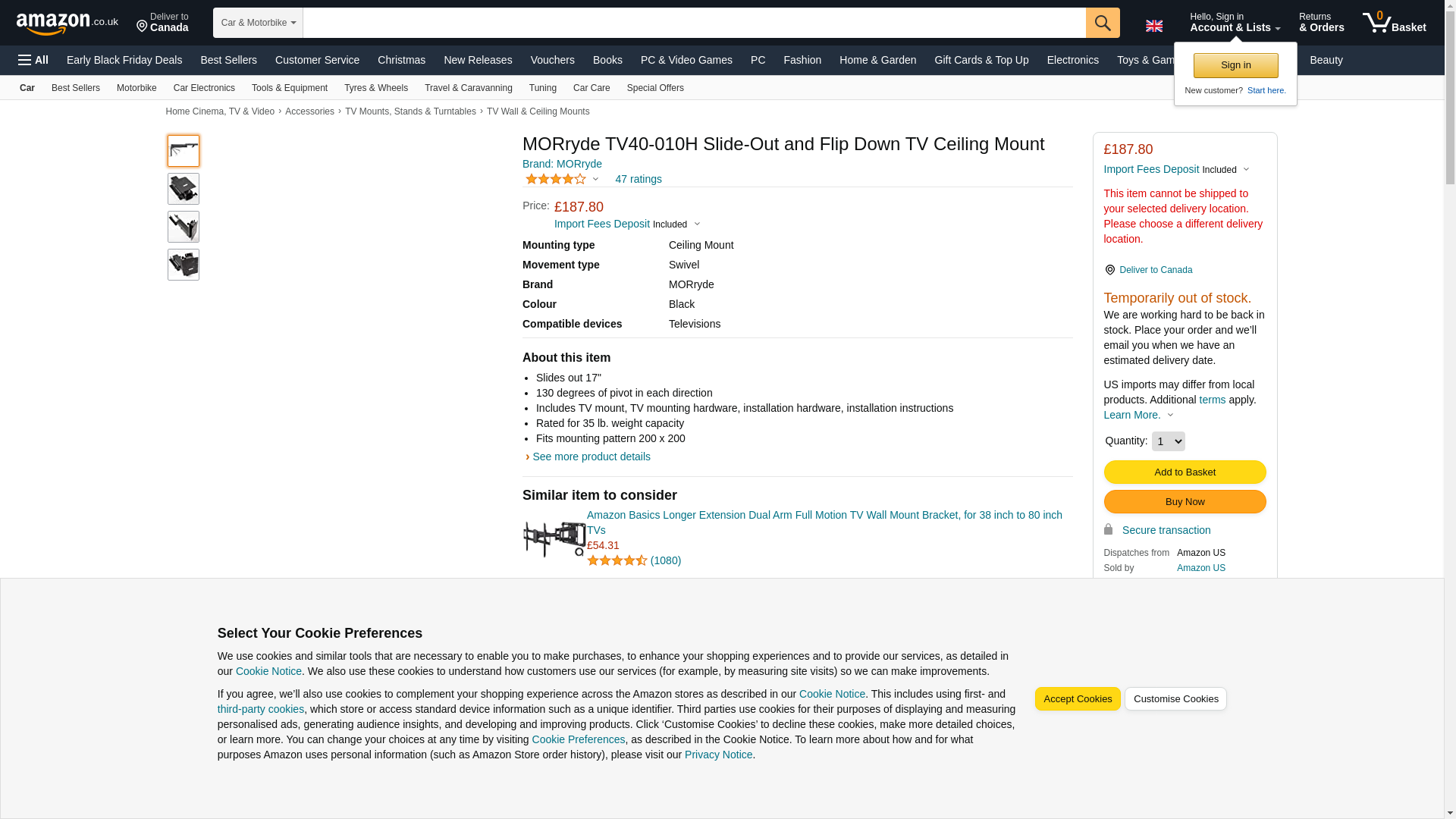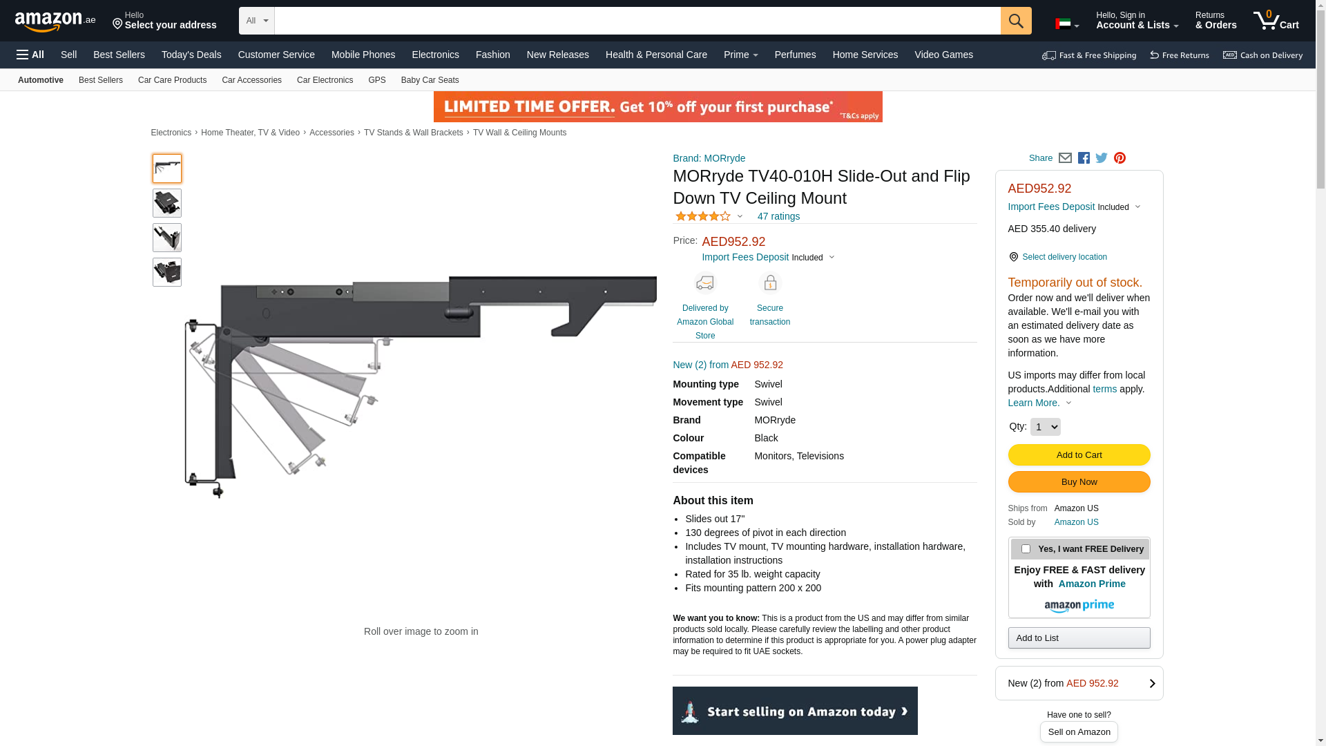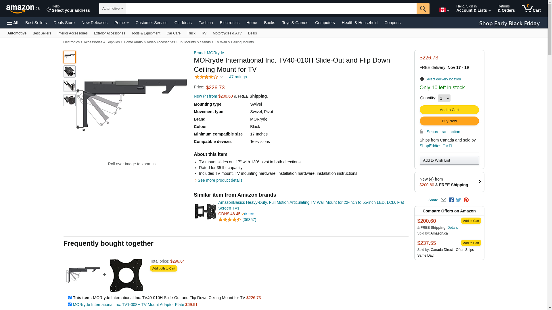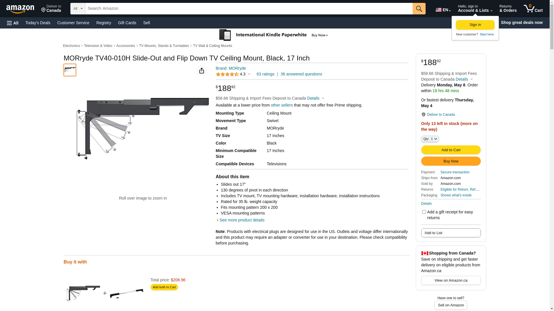 - TV Mount; Ceiling Mount; Sliding And Flip Down Type; 17 Inch Slide Out And 130 Degree Pivot; 7.5 Inch Height x 20-1/2 Inch Width; 45 Pound Capacity; Black; With TV Mount/ TV Mounting Hardware/ Installation Hardware And Installation Instruction; VESA Pattern Up To 200 Millimeter x 200 Millimeter