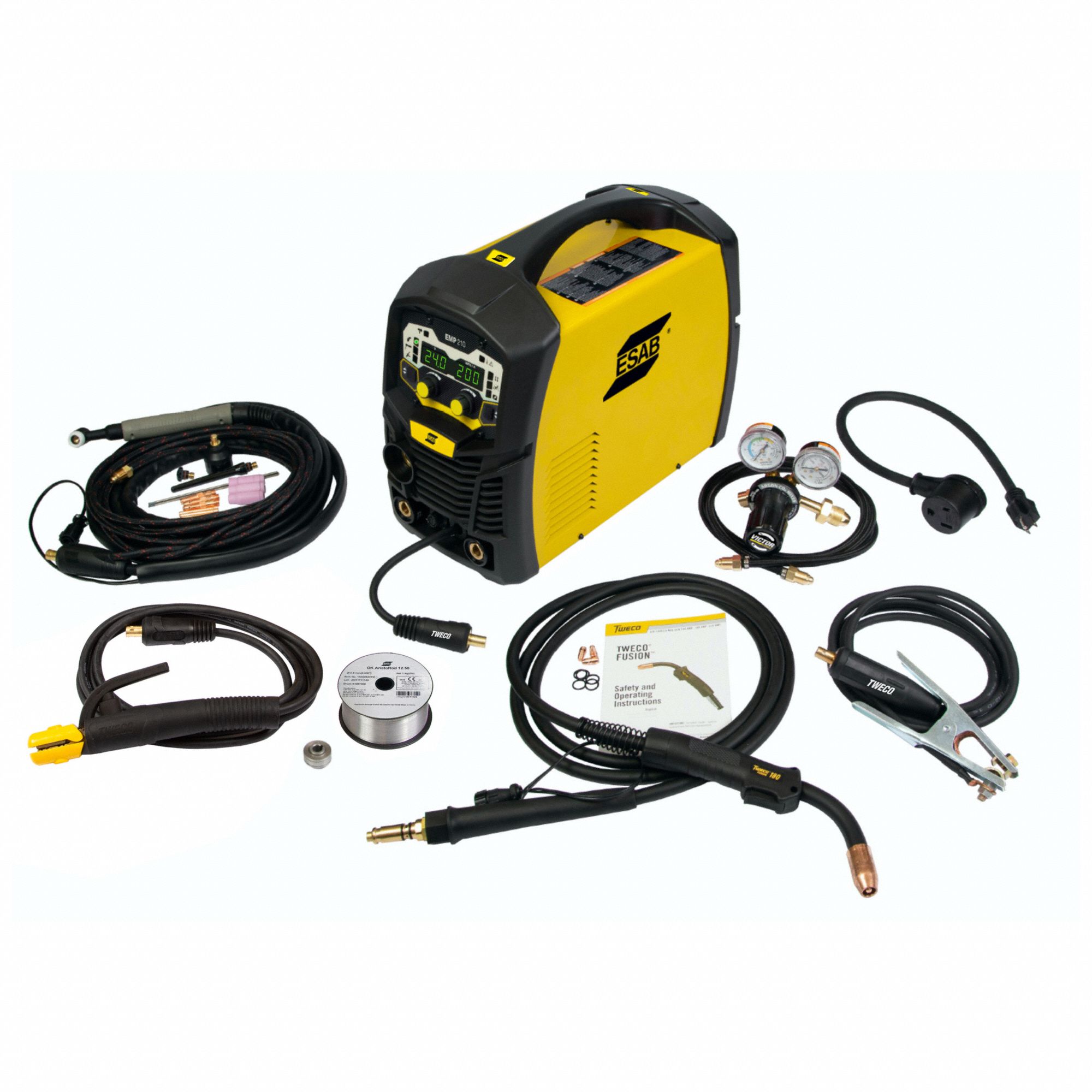 - packaging includes a Tweco Fusion 180 MIG gun with Velocity consumables, Victor Argon/CO2 regulator, Tweco ground clamp with heavy duty 50 mm Dinse connection, 50A-15A (120/230V) power adapter, sample wire spool of ESAB OK AristoRod 12.50 mild steel wire (2#) and 0.024/0.030 and 0.030/0.035 drive rolls.