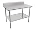 Work Table has 11⁄2" stallion edge on front and rear with straight turndown edge on sides. NSF approved. 5" backsplash. 16 gauge stainless steel top with adjustable galvanized steel legs and bullet feet. Galvanized undershelf. 96"Wx30"Dx353⁄4"H. (Does not include backsplash height). 149 lbs.