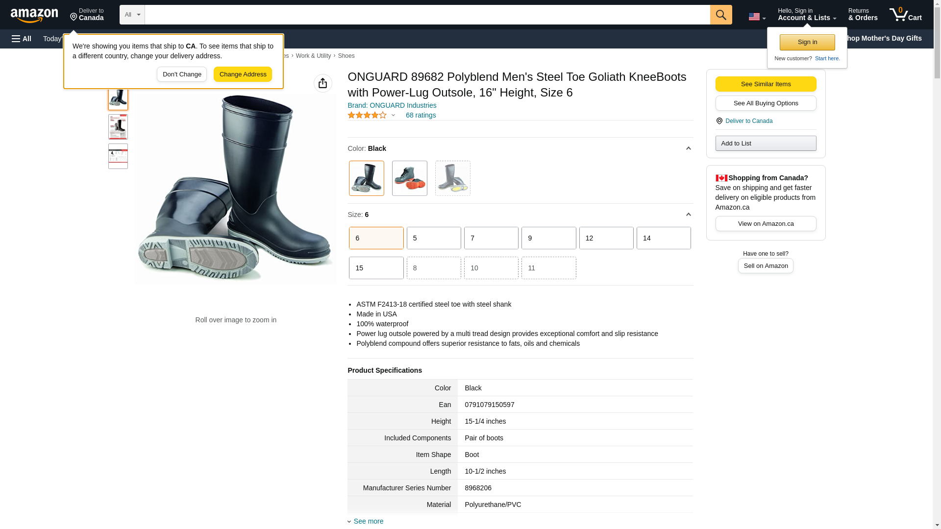 Onguard Men's Boot, 16" Goliath Black Steel Toe W/Power Lug Outsole, PVC, Size 6