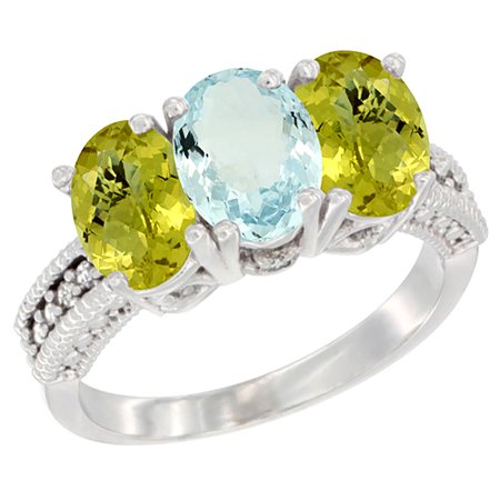 10K White Gold Diamond Natural Aquamarine & Lemon Quartz Ring 3-Stone 7x5 mm Oval, sizes 5 - 10