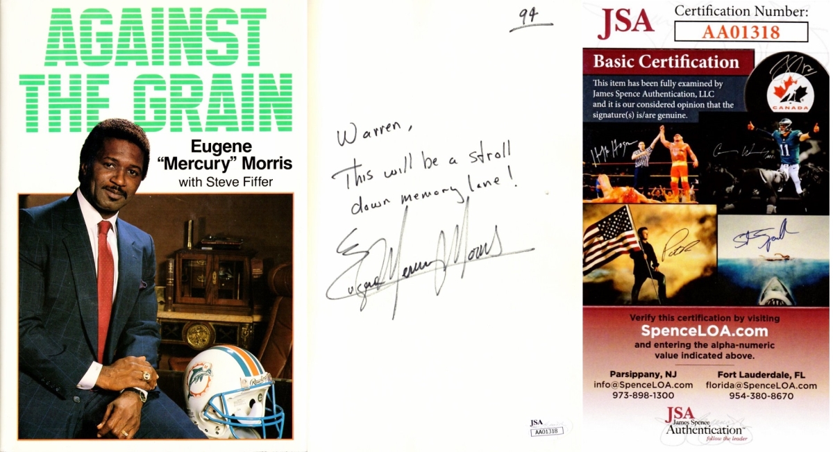 Real Deal Memorabilia MMorrisBook-1-JSA TO WARREN - Mercury Morris Signed - Autographed Against the Grain Book - Miami D