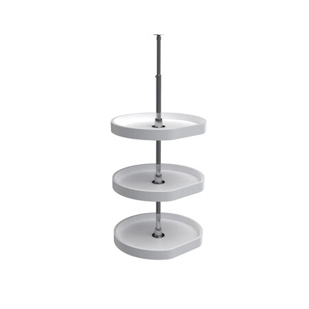 This White D-Shaped Dependently Rotating Shelf is designed for diagonal wall cabinets. Independently Rotating Shelves. All shaft assemblies are telescoping for variations in inside cabinet height & shelf height can be adjusted easily with one screw. Includes two shelves, mounting hardware and telescoping shaft assembly to accommodate 38" to 46" inside cabinet height.