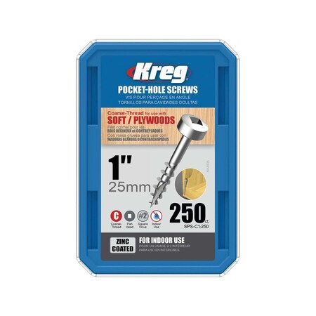 Kreg SPS-C1-250 Zinc Pocket Screws, 1-Inch #7 Coarse Thread, Pan- Head (250 Count)