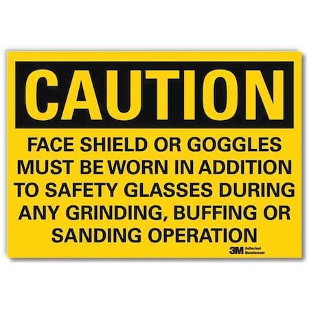 Safety Sign, Horizontal Rectangle, Number of Printed Sides 1, English, Sign Format Traditional OSHA, Sign Legend Face Shields Or Goggles Must Be Worn In Addition To Safety Glasses During Any Grinding, Buffing Or Sanding Operation, Sign Legend Background Color Yellow, Sign Legend Style Text