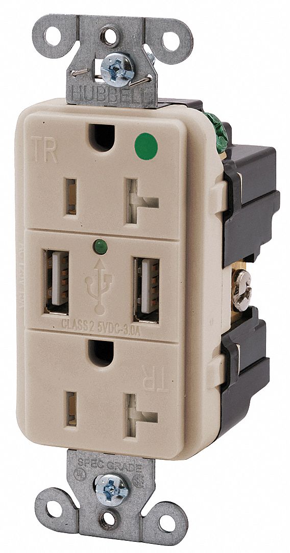 This USB-charger tamper-resistant receptacle combines USB DC power and tamper-resistant AC electrical power in a standard, single-gang opening, so you can charge personal electronics and power appliances from the same receptacle. A green LED light indicates USB power is available. The decorator flush-fit design fits most single-gang plastic or metal junction boxes. Receptacles are impact- and chemical-resistant. Back and side wire for solid or stranded wire.<br /><br /> Item: USB Charger Receptacle<br /> Application Environment: Hospital Grade<br /> USB Charging Capacity: 3.0A @ 5VDC<br /> Amps - Plugs and Receptacles: 20<br /> Number of USB Ports: 2<br /> USB Connector: Type A<br /> Tamper Resistance: Yes<br /> Wiring Method - Plugs and Receptacles: Back and Side<br /> Color - Plugs and Receptacles: Light Almond<br /> Type - Plugs and Receptacles: USB<br /> Mounting Type - Plugs and Receptacles: Flush<br /> Voltage - Plugs and Receptacles: 125VAC<br /> NEMA Receptacle Configuration - Plugs and Receptacles: 5-20R<br /> Outlet Type - Plugs and Receptacles: Decorator Duplex<br /> Power Indicator: No<br /> Weather Resistant - Plugs and Receptacles: No<br /> Item - Plugs and Receptacles: Receptacle<br /> Number of Poles: 2<br /> Number of Wires: 3<br /> Phase: 1<br /> HP: 1<br /> Material of Construction: Nylon<br /> Standards: UL/cULus<br />