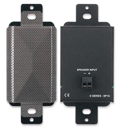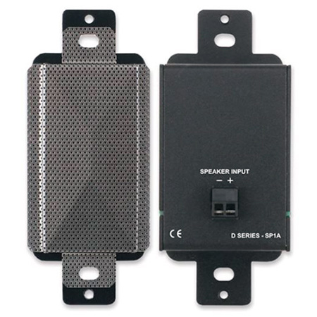 The D SERIES-SP1A is a compact 8 ohm loudspeaker that delivers rich, detailed sound in Decora-compatible wall or chassis mounts. The driver is constructed of materials found in premium larger speakers. The unique steel enclosure provides full baffling in a tightly sealed rigid structure. This produces sonic presence within an extended frequency range expected from larger speakers. Internal filtering rolls off out-of-band frequencies to reduce distortion and increase peak power capability. Dispersion covers a hemispherical area of nearly 180 degrees with the speaker mounted in a wall.</p><p>The input is connected through a 2-position detachable terminal block on the rear panel. The D SERIES-SP1A operates with a continuous audio input up to 2 watts, making it suited to be driven by speech or music content from amplifiers with a maximum rated power of up to 10 W. Models are available with grills in black (DB-SP1A), white (D-SP1A), gray (DG-SP1A) or <strong>stainless steel (DS-SP1A)</strong>.</p><p><strong>Please note: Coverplate is not included and must be purchased separately.</strong></p>