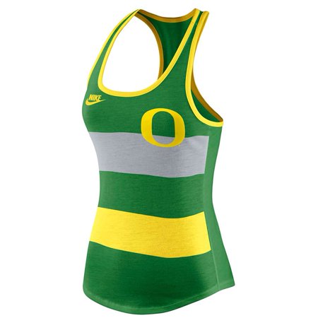 Tri-blend Oregon Ducks ladies racerback tank top by Nike. Features soft hand discharge print Oregon Ducks logo at right chest, Nike swoosh at right chest. Body features team color striping. 50% Polyester, 25% Cotton, 25% Rayon.