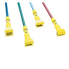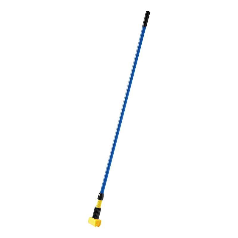 Plastic jaws firmly grip mop head. Allows quick mop changes. Ideal for 5" wide headband mops. Handle Length: 60 in; Handle Diameter: 1 in; Handle Material: Fiberglass; Color(s): Blue/Yellow.