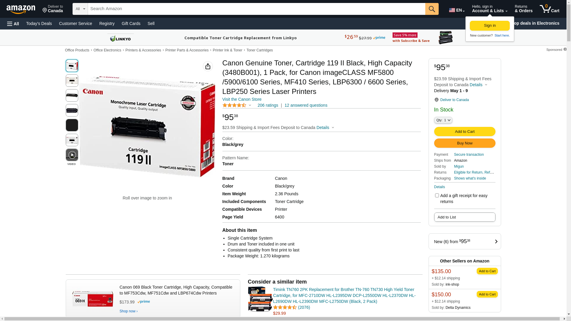 - Canon 3480B001AA OEM Toner - (CRG-119II) imageCLASS LBP6300dn LBP6650dn LBP6670dn MF5850dn MF5880dn MF5950dw MF5960dn MF6160dw MF6180dw Toner (6400 Yield) OEM