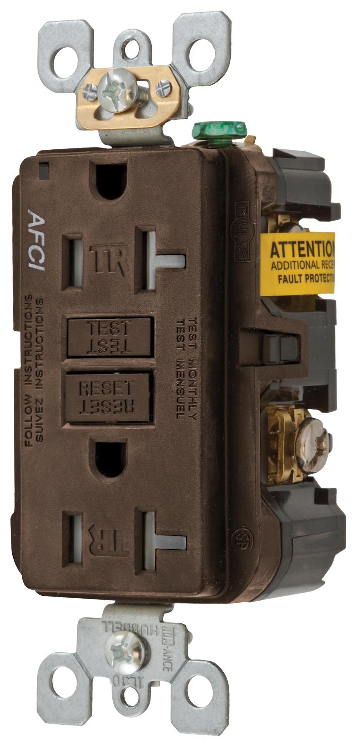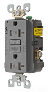 HUBBELL arc fault receptacle helps to protect against electrical fires originating from arcing faults. Tamper resistant Self grounding clip<br /><br /> Item: Receptacle<br /> Type - Plugs and Receptacles: Straight Blade<br /> Application Environment: Commercial Environments<br /> Amps - Plugs and Receptacles: 20<br /> NEMA Receptacle Configuration - Plugs and Receptacles: 5-20R<br /> Voltage - Plugs and Receptacles: 125VAC<br /> Number of Poles: 2<br /> Number of Wires: 3<br /> Tamper Resistant: Yes<br /> Weather Resistant - Plugs and Receptacles: No<br /> Outlet Type - Plugs and Receptacles: Standard Duplex<br /> Mounting Type - Plugs and Receptacles: Flush<br /> Color - Plugs and Receptacles: Gray<br /> Item - Plugs and Receptacles: Arc Fault Receptacle<br /> Wiring Method - Plugs and Receptacles: Back and Side<br /> Surge Suppression: No<br /> Material: Nylon<br /> Phase: 1<br /> HP: 1.0<br /> IP Rating: 20<br /> Power Indicator: No<br /> Corrosion Resistant: No<br /> Number of Gangs: 1<br /> Description: Finder Groove
