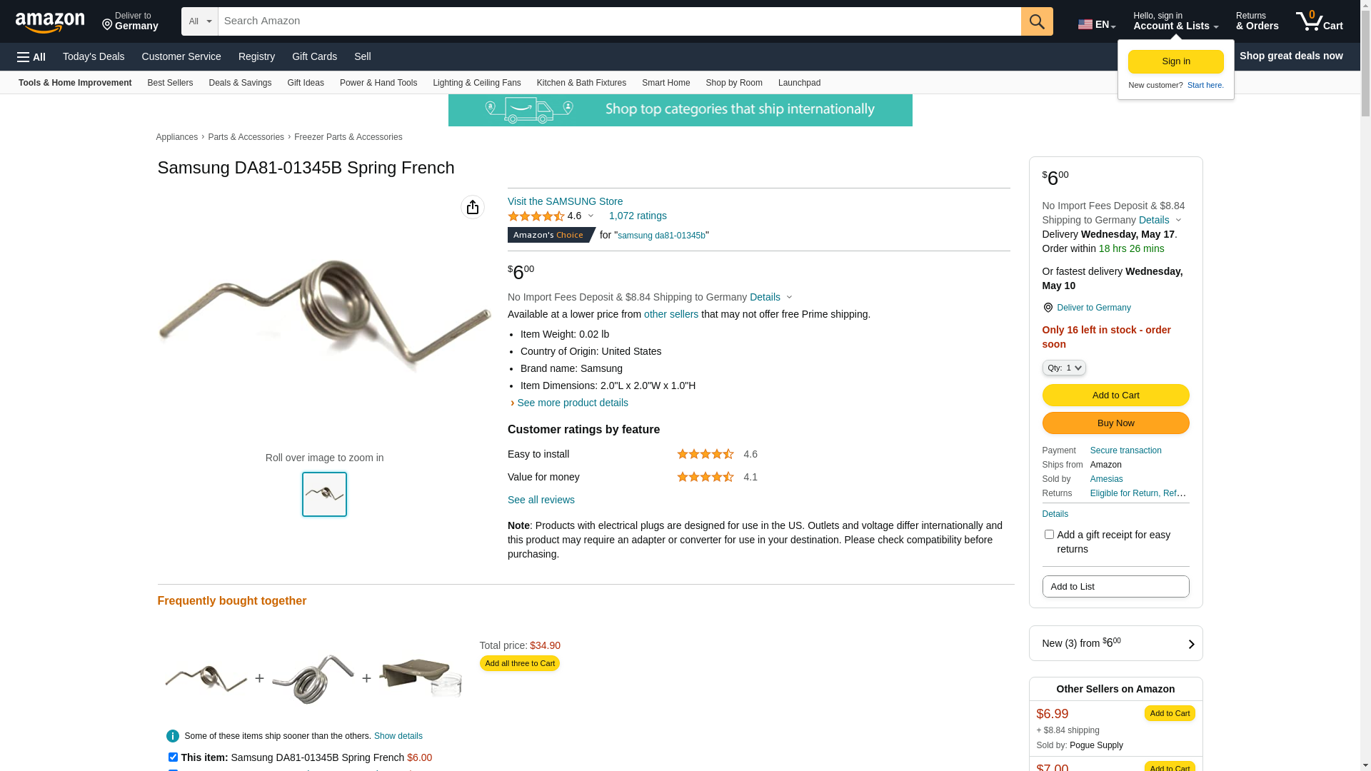 ![]() midwestapplianceparts.com | DA81-01345B-SAM-P | 1 | -2 | 1 | 1 @ $3.78 |