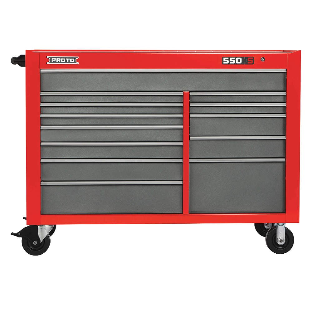 J4805 Rolling Cabinet 550S Series Industrial Premium Width 57 In. Depth 25-1/4 In. Height 43 In. Number of Drawers 13 Red Drawer Color Gray Drawer Capacity 400 lb. Ball Bearing Full Extension Drawer Slides Gloss/Matte Finish Storage Capacity 28 291 cu in. Load Rating 3600 lb. Caster Size 6 in x 2 In. Number of Shelves 0 Steel Bottom 14 Side 16 Drawers 18 Gauge Work Surface Material Steel Vinyl Caster Wheel Material Glass Filled Nylon