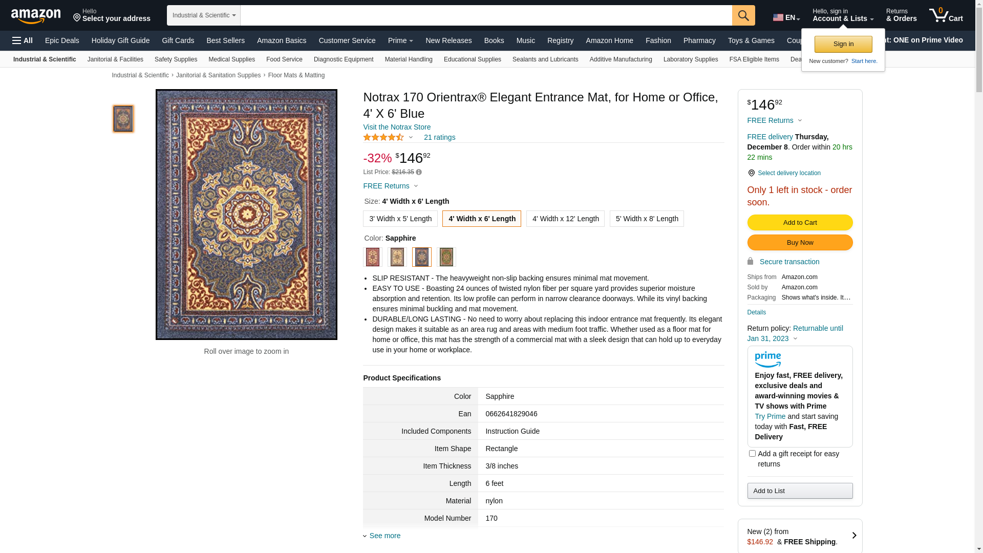 Notrax 170 Orientrax® Elegant Entrance Mat, for Home or Office, 4' X 6' Blue