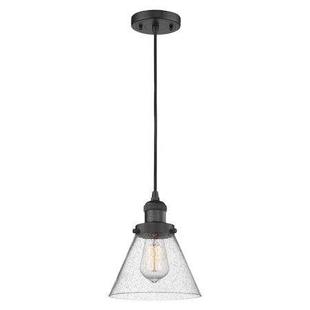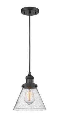 This 1 light Mini Pendant from the Franklin Restoration Large Cone collection by Innovations Lighting will enhance your home with a perfect mix of form and function. The features include a Matte Black finish applied by experts. Product Features Include: Brand: Innovations Lighting, Collection: Franklin Restoration Large Cone, SKU: 201C-BK-G44-LED, UPC: 638932465934, Category: Mini Pendant, Finish: Matte Black, Glass: Seedy Large Cone, Material: Steel/Cast Brass/Glass, Designer: Bruno Marashlian, Length: 130.00 in., Width: 8.00 in., Height: 10.00 in., Max Height: 131.25 in., Diameter: 8.00 in., Backplate/Canopy Width: 4.50 in., Backplate/Canopy Length: 4.50 in., Backplate/Canopy Thickness: 0.75 in., Weight: 2.75 lb., Included Chain/Rods/Cord: 10 Feet Of Black Textured Cord, Warranty: 2 Year Finish, Lifetime Electrical, Bulbs Included: Yes, Bulb Category: LED, Primary Bulb(s): 1 x 3.50 watts Medium Base ST64 Vintage, Color Temperature: 2700K, Color Rendering Index: 82.0000, Total Lumens: 350, Voltage: 120, Safety Rating: UL/ETL Damp Location, Title 20 Approved