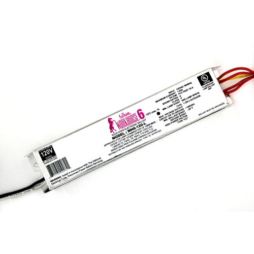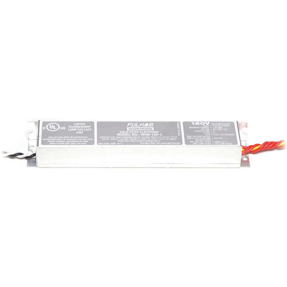 The Fulham WH6-120-L electronic ballast powers a variety of different fluorescent lamps ( download wiring diagram to see ). Workhorse ballasts are compact, lightweight, and extremely versatile. Operates on 120 VAC input. 5 year warranty.
