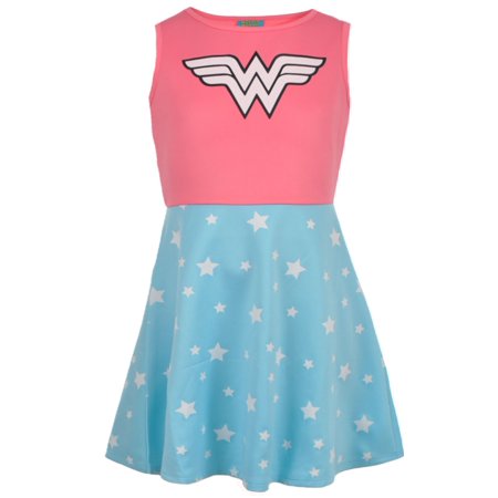 Give your Wonder Woman fan the colorful style of this dress! <ul> <li>Wonder Woman dress</li> <li>Printed scuba construction</li> <li>Contrast bodice with graphic</li> <li>94% polyester, 6% spandex</li> <li>Machine wash cold, inside out</li> <li>Imported</li> </ul>