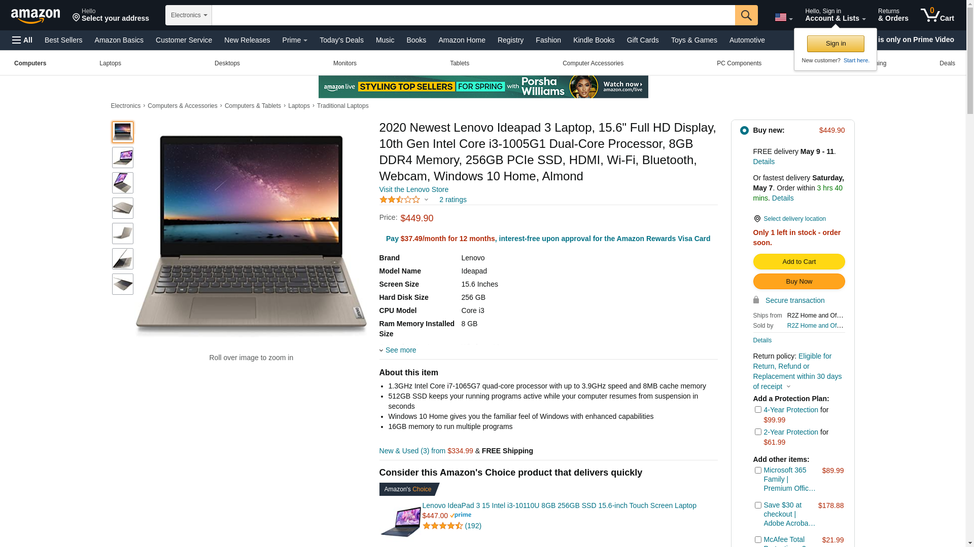 Lenovo Ideapad 3 Laptop, 15.6" Full HD Display, 10th Gen Intel Core i3-1005G1 Dual-Core Processor, 8GB DDR4 Memory, 256GB PCIe SSD, HDMI, Wi-Fi, Bluetooth, Webcam, Windows 10 Home, Almond