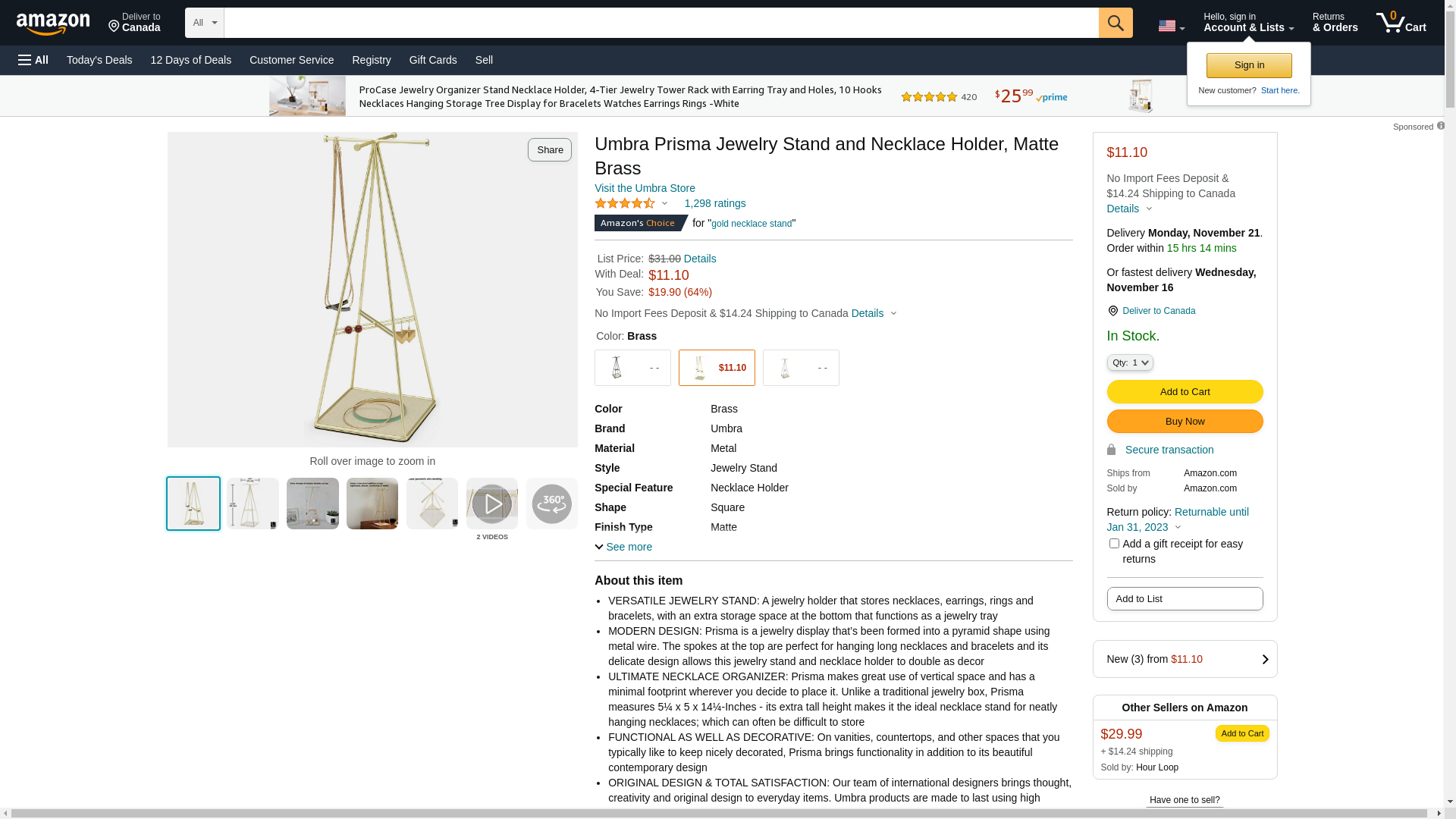 Umbra Prisma Jewelry Stand and Necklace Holder, Matte Brass