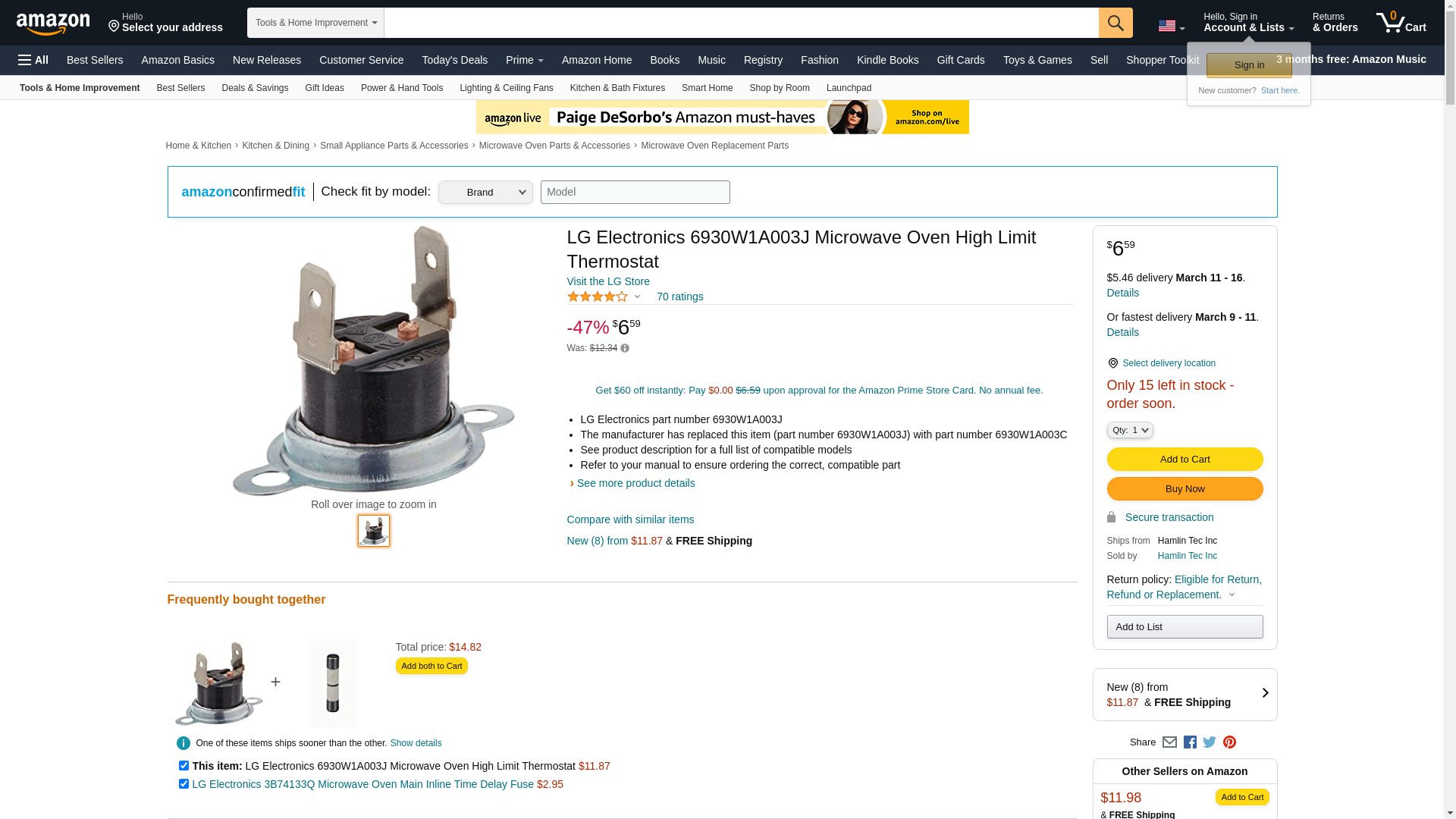 ![]() lgparts.com | 6930W1A003J | 1 | 136 | 1 | 1 @ $15.95 |