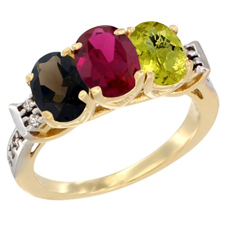 10K Yellow Gold Natural Smoky Topaz, Enhanced Ruby & Natural Lemon Quartz Ring 3-Stone Oval 7x5 mm Diamond Accent, sizes 5 - 10