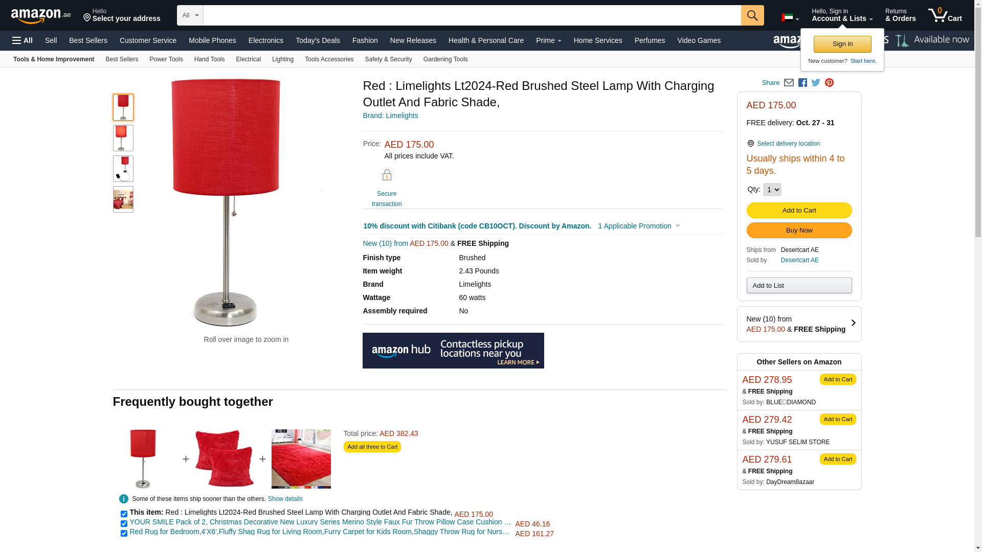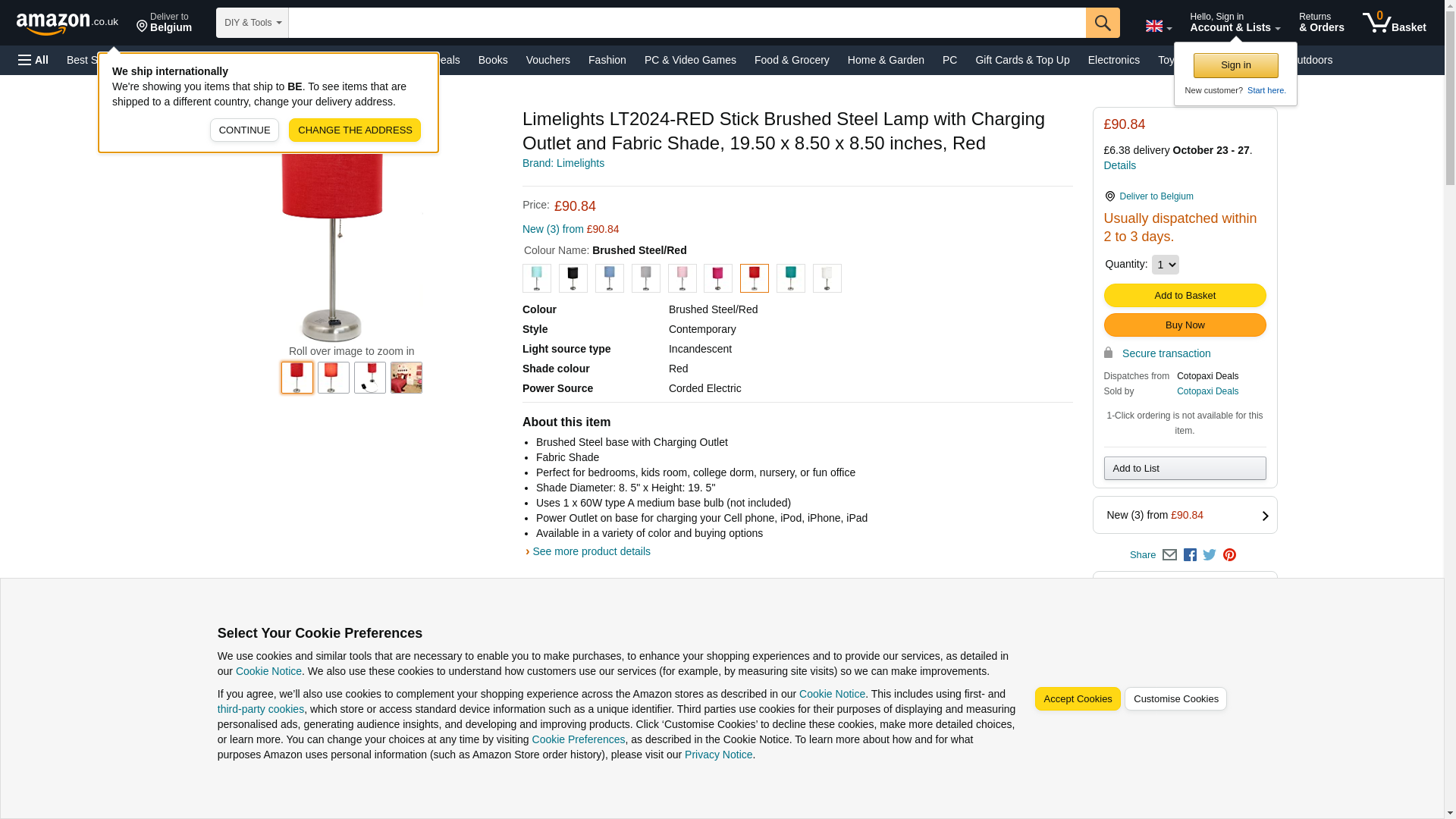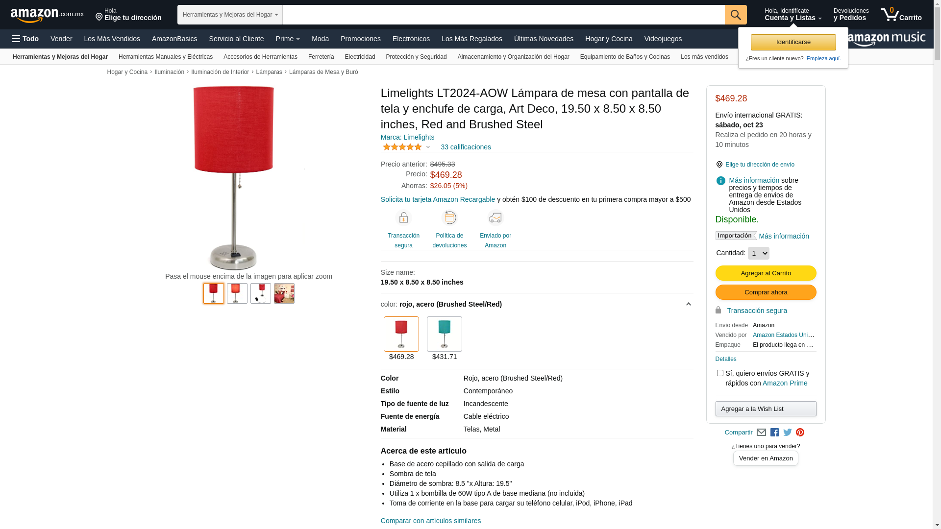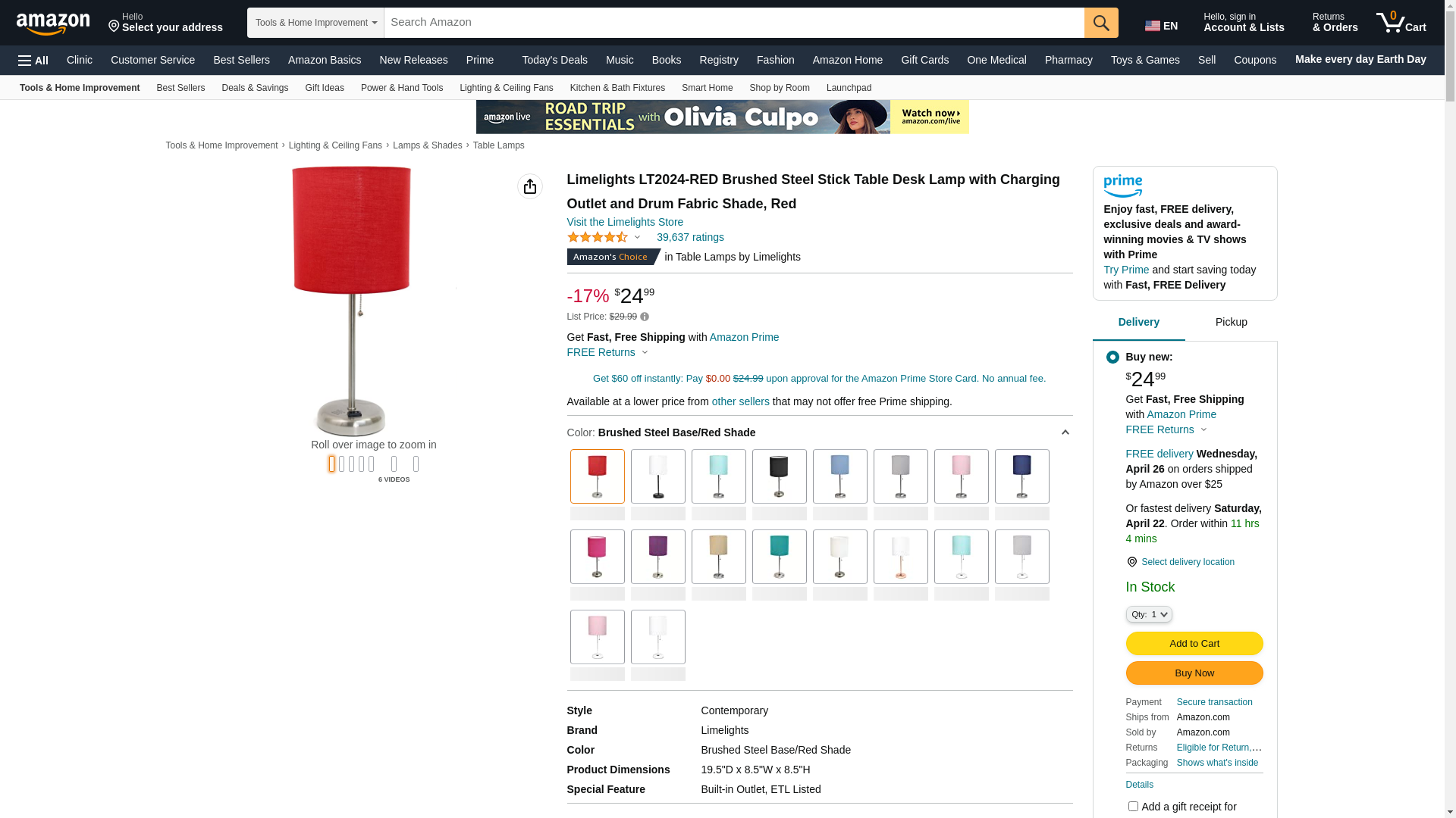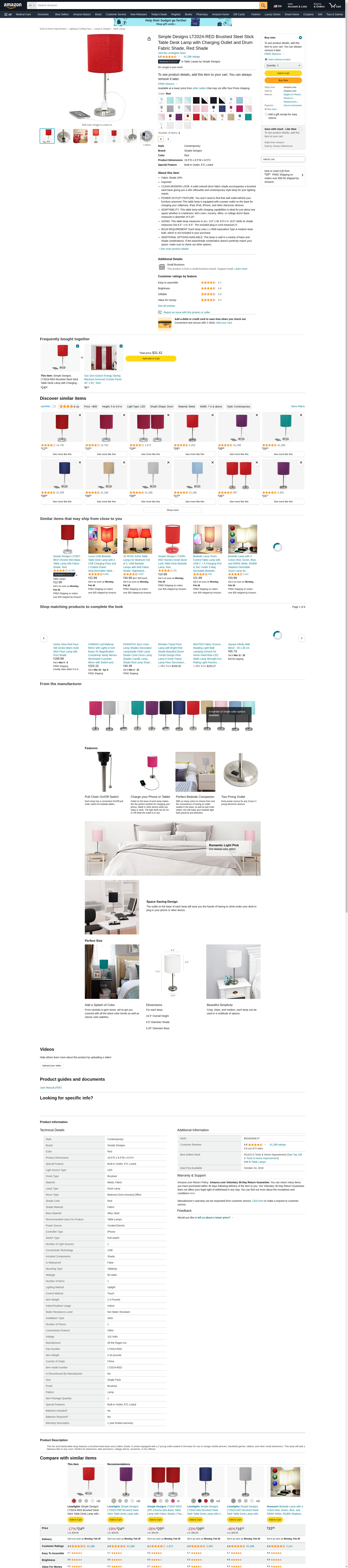 LimeLights LT2024-RED Brushed Steel Stick Table Desk Lamp with Charging Outlet and Drum Fabric Shade, Red