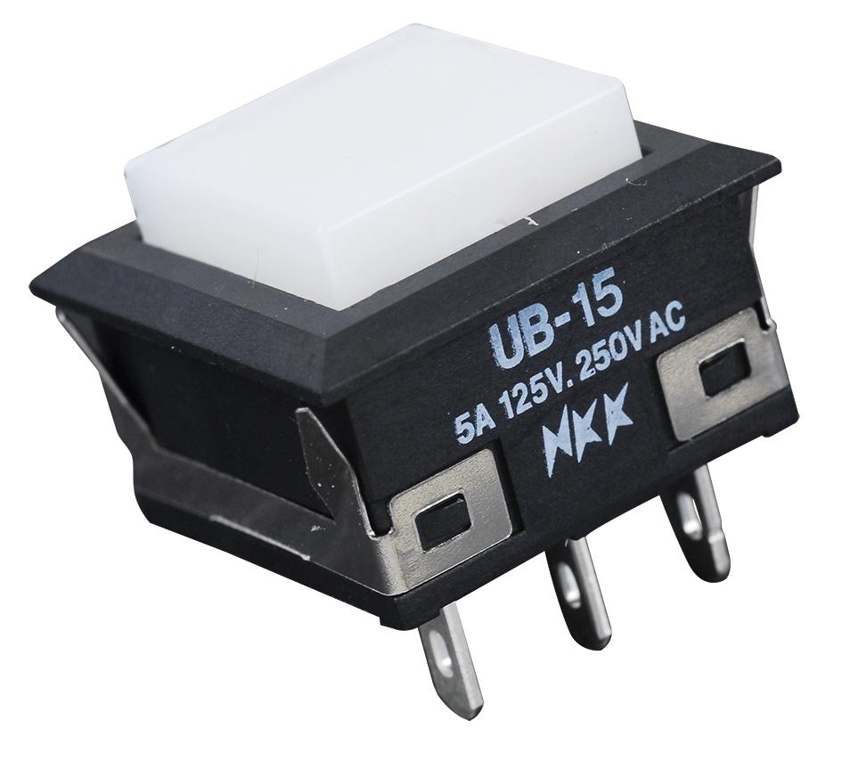 NKK Switches - UB15KKW01N-B - Switch,P/B,SPDT,ON-(ON),Square,Snap-In,Non-Illum,White Cap,5A,125VAC,Solder - Allied Electronics & Automation, part of RS Group