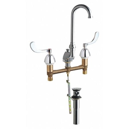 The Chicago 794-GN2FC317ABCP Manual and Metering Faucet. This concealed hot/cold water sink faucet with pop-up assembly features 8" fixed centers, a 1.5 GPM Laminar flow control insert, and a 5-1/4" flow control rigid/swing gooseneck spout. It comes with