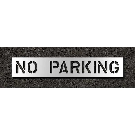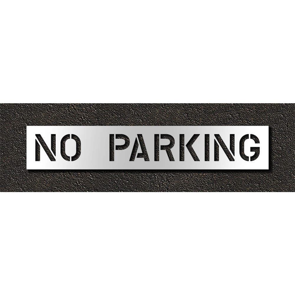 'Pavement Stencil, Character No Parking, Character Height 10 In., Character Width 82 In., Material Low Density Polyethylene, Thickness 0.063 In., Overall Height 16 In., Overall Width 89 In., Character Type Letters, Self-Adhesive No, Nonmagnetic, Interlock No, Reusable Yes, Number of Pieces 1'