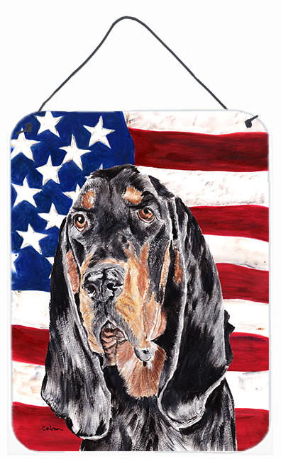 Carolines Treasures SC9511DS1216 8 x 12 In. Coonhound Black and Tan USA American Flag Aluminium Metal Wall or Door Hangi