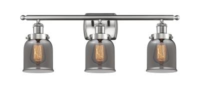 INNOVATIONS LIGHTING 916-3W-SN-G53-LED Small Bell 3 Light Bath Vanity Light part of the Ballston Collection. Collection: Ballston. Metal Finish (Body): Brushed Satin Nickel. Metal Finish (Canopy/Backplate): Brushed Satin Nickel. Glass or Metal Shade Color: Plated Smoke. Material: Steel, Cast Brass, Glass. Shade Material: Glass. Dimension(in): 12(H) x 26(W) x 6.5(Ext). Backplate Dimension(in): 4.5(H) x 6(W) x 0.75(D). Shade Size(in): 6(H) x 5(Dia). Bulb: (3) 3.5 Watt LED Vintage Medium Base Bulb Included. Voltage: 120. Dimmable: Yes. Color Temperature(Kelvin): 2700. CRI: 82. Lumens: 350. Glass Type: Colorful . Glass or Metal Shade Shape: Bell. Shade Fitter Measurement: Neckless with a 2.125 inch Hole. Style: Industrial, Modern Contempo, Restoration-Vintage, Transitional . Ul Certification Type: Damp Location. Warranty: 2 Year Finish, Lifetime Electrical.