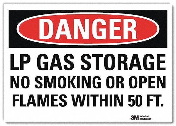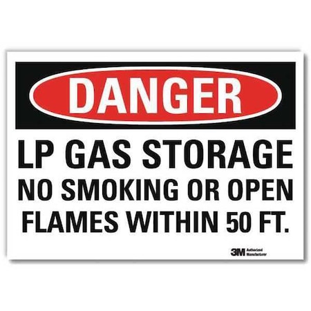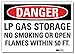Danger No Smoking Sign, Horizontal Rectangle, Number of Printed Sides 1, English, Sign Format Traditional OSHA, Sign Legend Lp Gas Storage No Smoking Or Open Flames Within 50 Ft., Sign Legend Background Color White, Sign Legend Style Text