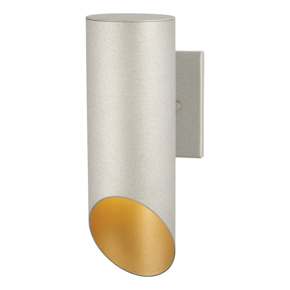 Embrace a contemporary aesthetic with the geometric charm of this outdoor wall light from Minka Lavery. A smooth cylinder in a sand silver finish brings great visual contrast in the sun and in the dark sky. A striking gold finish coats the interior, emitting a stunning ray of warmth.