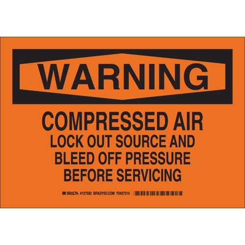 Brady 127591 WARNING Compressed Air Lock Out Source And Bleed Off Pressure Before Servicing Sign - Light Duty Plastic - Black on Orange - 7 x 10