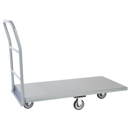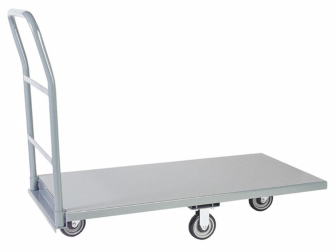 Steel-Deck Platform Truck, Load Capacity 1,200 lb, Overall Height 39 in, Overall Length 41 in, Overall Width 25 in, Deck Construction Solid, Deck Material Steel, Deck Finish/Coating Powder Coated, Deck Gauge 12 ga, Deck Height 9 in, Deck Length 36 in, Deck Width 24 in, Deck Surface Smooth, Frame Material Steel, Frame Finish/Coating Powder Coated, Handle Type Raised, Side Panel Type No Side Panels, Number of Platforms 1, Color Gray