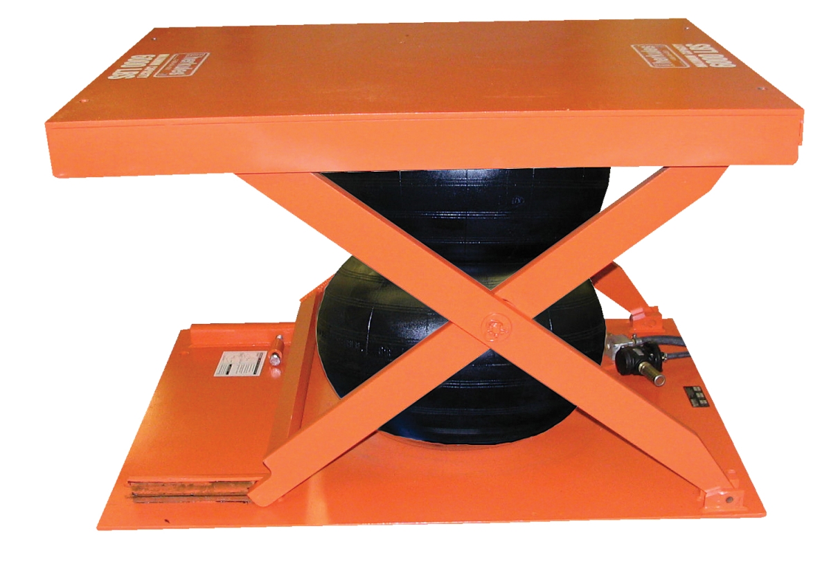 The Low-Profile Air Bag Scissor Lift Table is the lowest collapsed air lift table on the market. The low height allows for more material to be placed on the lift and still be in reach of the operator. The unit has a pressure relief valves to prevent over inflation of the air bag, as well as a captured scissor track to provide stability and safety while raising and lowering. There are various optional components such as: up/down foot control, safety skirt, and larger platforms available. Limited Warranty: 1 year. Uniform Capacity (lbs.): 3,000, Raised Height (in.): 29, Required (psi): 60-120, Pipe or Rubber Hose Minimum (in.): 3/4, Operation Method: Hand controller, joy stick style ,