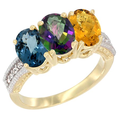 10K Yellow Gold Diamond Natural London Blue Topaz, Mystic Topaz & Whisky Quartz Ring 3-Stone Oval 7x5 mm, sizes 5 - 10