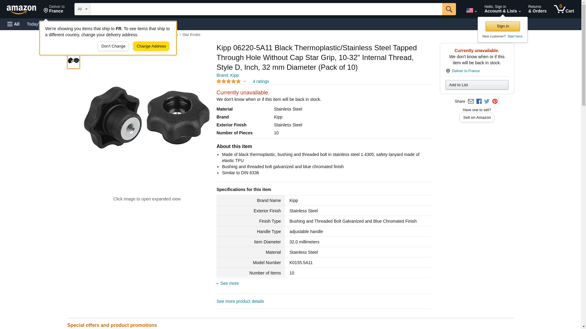 Kipp 06220-5A11 Black Thermoplastic/Stainless Steel Tapped Through Hole Without Cap Star Grip, 10-32" Internal Thread, Style D, Inch, 32 mm Diameter (Pack of 10)