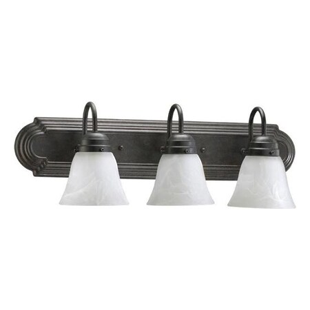 5094-3-144 Finish: Toasted Sienna, Bulb: 100 Watt, Shade Color: White Faux Alabaster Glass Features: -Three light bath vanity.-White faux alabaster glass.-Transitional style.-UL listed for damp locations. Options: -Available in chrome, cobblestone, toasted sienna, satin nickel or old world finishes. Specifications: -Accommodates (3) 100W medium base bulb. Dimensions: -Overall dimensions: 8'' H x 24'' W x 7.75'' D.