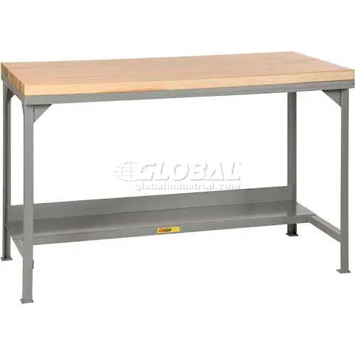 Workbench with lower shelf and 3,000 lb. total load capacityWelded steel frame for rigidity and strengthReplaceable butcher block top for shock absorption, resistance to impact, and helping to minimize noise from impactGray finish on steel frame for resistance to corrosionLower half-shelf with 3" lip at back for storing items while providing legroom, Lot of 1