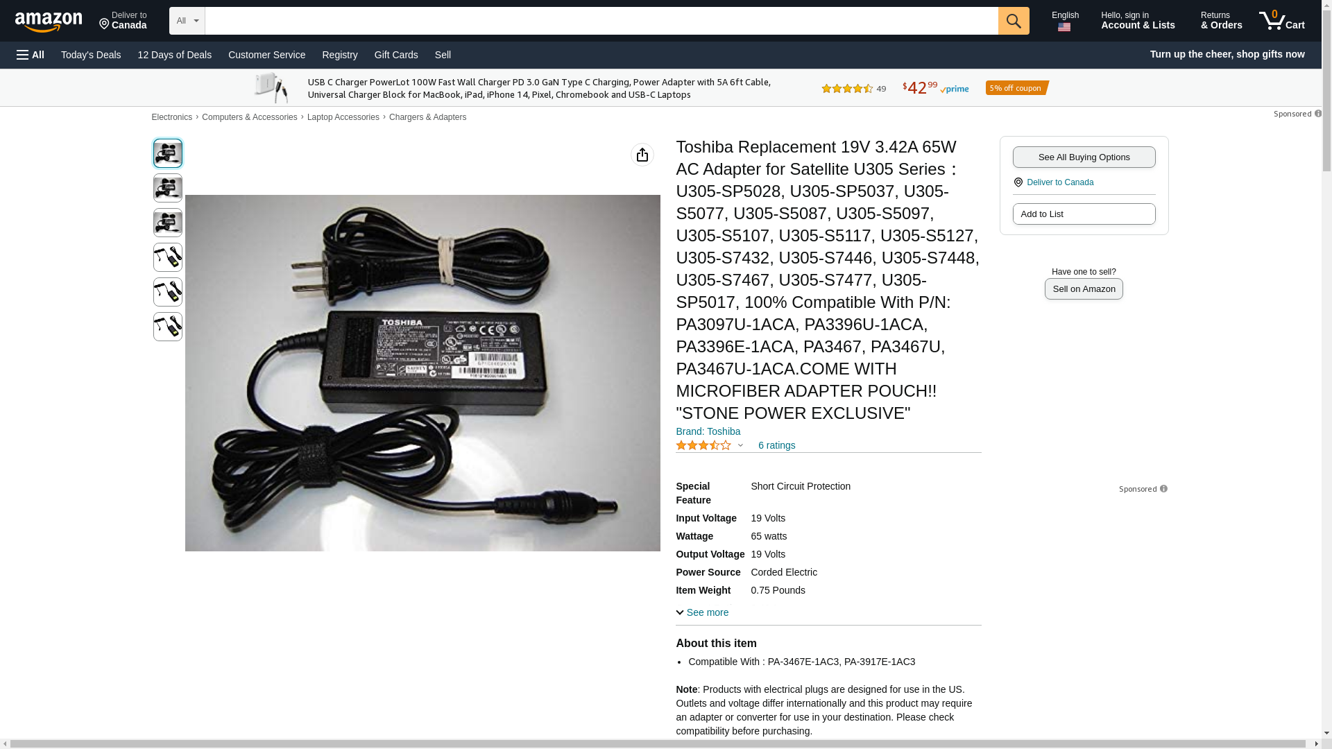 Toshiba Replacement 19V 3.42A 65W AC Adapter for Satellite U305 Series: U305-SP5028, U305-SP5037, U305-S5077, U305-S5087, U305-S5097, U305-S5107, U305-S5117, U305-S5127, U305-S7432, U305-S7446, U305-S7448, U305-S7467, U305-S7477, U305-SP5017, 100% Compatible With P/N: PA3097U-1ACA, PA3396U-1ACA, PA3396E-1ACA, PA3467, PA3467U, PA3467U-1ACA.COME WITH MICROFIBER ADAPTER POUCH!! "STONE POWER EXCLUSIVE"