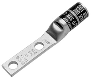 Burndy YA2CL2NT14E2 Two Hole Hylug Code Conductor Standard Barrel Copper Compression Narrow Tongue Terminal, #2 AWG Conductor, 1/4" Stud Hole Size, 3/4" Stud Hole Spacing, 0.48" Tongue Width, 2.60" Length
