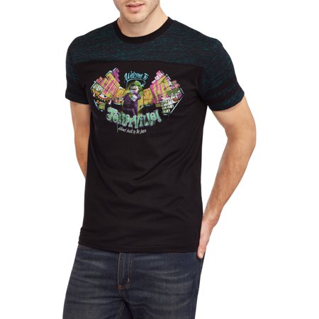 <br /> <b>LEGO Batman Movie Men's Jokerville Yoke Tee:</b> <ul> <li>Body: 60% cotton, 40% polyester </li> <li>Yoke/Sleeve: 97% polyester, 3% other fiber </li> <li>T-shirt </li> <li>Front Joker graphic </li> <li>Stripes on Short sleeves </li> <li>Contrast yoke and sleeves </li> <li>Ribbed crew neck </li> <li>Machine wash cold with like colors, only non-chlorine bleach when needed, tumble dry low, do not iron if decorated, do not dry clean</li> </ul><p>Country of Origin: Imported