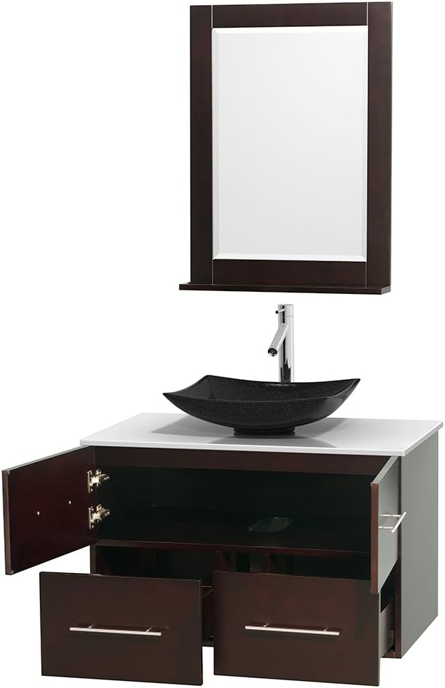 Wyndham Collection 36" Single Bathroom Vanity in Espresso, White Man-Made Stone Countertop, Arista Black Granite Sink, and 24" Mirror