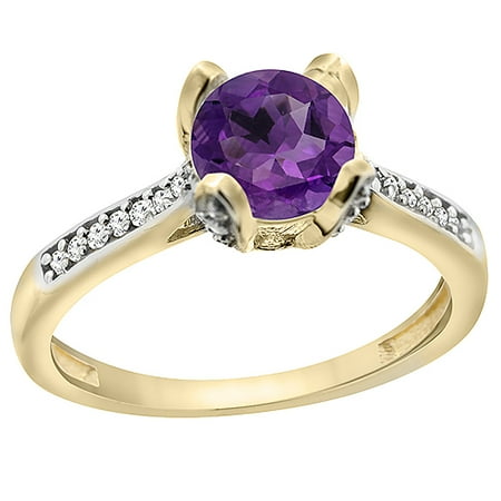 10K Yellow Gold Natural Amethyst Ring Round Shape 7mm Diamond Accent, sizes 5 to 10 with half sizes
