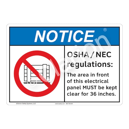 <p><strong>Word Message: </strong><br />OSHA/NEC regulations: The area in front of this electrical panel MUST be kept clear for 36 inches. </p><p><strong>Description: </strong><br />Clarion Safety Systems brings you high quality notice OSHA/NEC safety signs (ITEM# F1152-) which are produced on premium plastic material and are expertly designed to meet your electrical hazard sign needs. </p><p><strong>Material Information:</strong></p> <ul> <li><strong>Material</strong>: (Z1) Outdoor Flexible Polyester</li> <li><strong>Base Materials</strong>: 3M .002 premium white polyester</li> <li><strong>Overlaminate</strong>: 3M .003 ultra-clear weatherable UV resistant</li> <li><strong>Mounting Option</strong>: 3M Premium Structured Acrylic</li> <li><strong>Application</strong>: Indoor/Outdoor</li> <li><strong>MaxTemp</strong> (F): 175</li> <li><strong>MinTemp</strong> (F): -40</li> <li><strong>Chemical Resistance</strong>: Excellent</li> <li><strong>UV Resistance</strong>: Excellent </li> <li><strong>Outdoor durability</strong>: Excellent</li> <li><strong>Storage Stability</strong>: Stable. Optimum storage conditions: 72 F @ 50% relative humidity</li> <li><strong>Expected Life Indoor</strong>: Long term</li> <li><strong>Expected Life Outdoor</strong>: 5 years plus (expected outdoor life may vary due to climatic conditions)</li> <li><strong>RoHS</strong>: Yes</li> <li><strong>CRoHS</strong>: Yes</li> <li><strong>REACH</strong>: Yes</li> </ul>