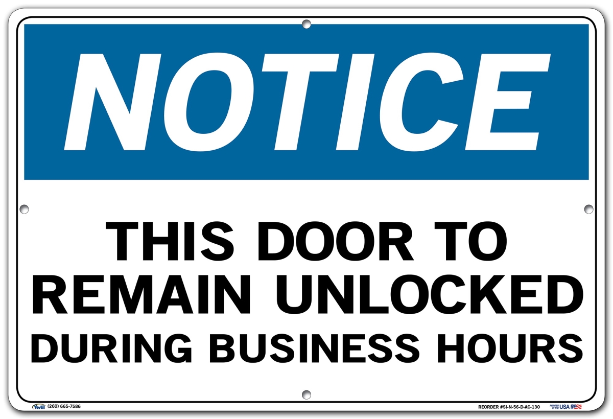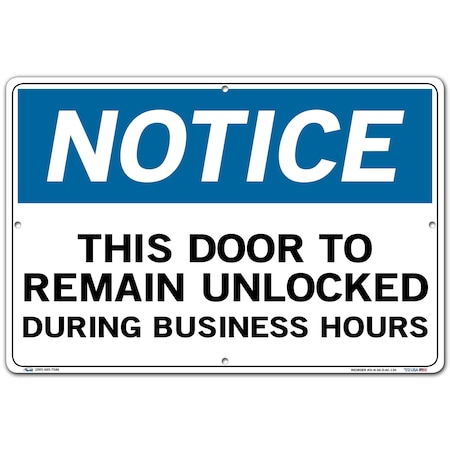 Vestil SI-N-56-D-AC-130 Notice Sign Aluminum Composite .130" Overall Size 18.5"W x 12.5"H This Door to Remain Unlocked During Business hours , 12.5" Height, 18.5" Wide, 0.13" Length
