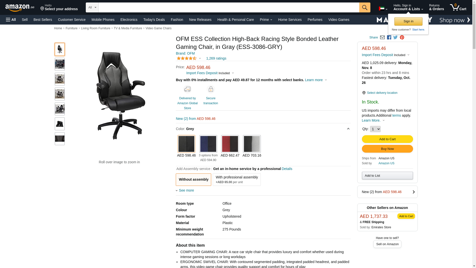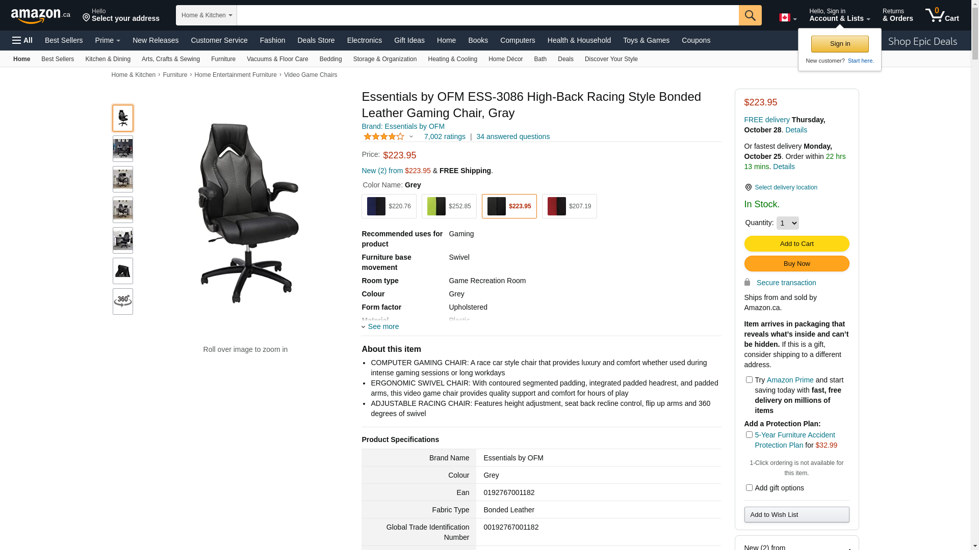 OFM ESS Collection High-Back Racing Style Bonded Leather Gaming Chair, in Gray (ESS-3086-GRY)