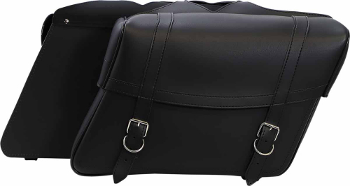 Large turn signal cutouts in yoke prevent need for turn signal relocation on some models. Medium: 13"L x 6"W x 9.5"H. Large: 15.5"L x 6"W x 9.5"H. Jumbo: 18"L x 6"W x 12"H. Throw-over design saddlebags made of Saddlehyde; available in three sizes and two different styles to fit every bike and storage need. Stylish dual-strap design with heavy-duty chrome-plated buckles. Box-style lid keeps contents secure. Adjustable yoke construction for a perfect fit on most popular cruisers. Rigid plastic backs and reinforced inner panels help maintain bag shape even when empty; bag supports recommended.