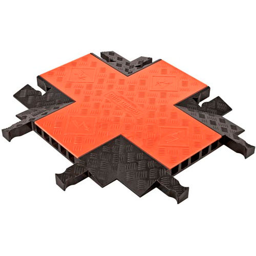 'Cable Protector 4-Way Cross, Hinged, Material Polyurethane, Connection Style Dog Bone, Number of Channels 5, Black, Orange, Cable Protection System Components Length 15-19/32 In., Width 19-3/4 In., Height 2 In., Channel Width 1-1/4 In., Channel Height 1-1/4 In., Load Capacity 10,500 lb., Max. Cable Dia. 1-1/4 In., For Use With Vehicle and pedestrian traffic. Ideal for amusement parks, entertainment venues, sporting events, industrial, construction, commercial applications'